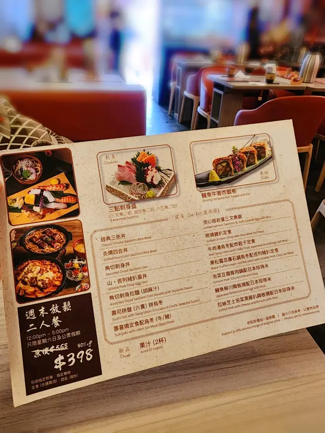 聽朋友介紹呢間係元朗嘅黑木亭居酒屋唔錯,就去試試,我哋揀咗🔆《週末放鬆二人餐 $398 》🔆, 個餐包括指定刺身、指定卷物、定食 (任選兩個)、飲品,定食方面有丼飯🥘、壽司🍣、鍋物🍲等等,選擇都好多😍