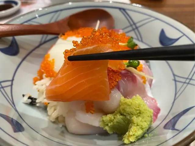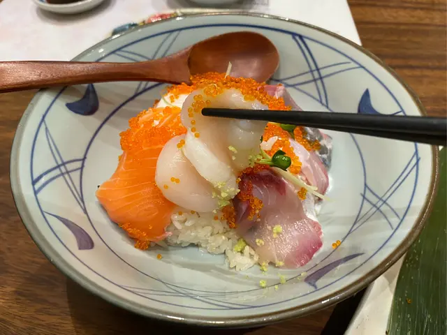 魚生飯三色有三文魚、油甘魚、帶子刺身,加上一隻溫泉蛋,面頭仲加咗唔少蟹籽提鮮,魚生食落新鮮嫩口,帶子鮮甜,味道唔錯。