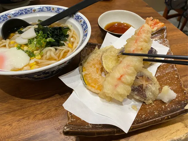 天婦羅有蝦、茄子、冬菇、蕃薯同南瓜,都好大碟,炸得香脆之餘唔會油膩,隻蝦仲要係實肉鮮蝦嘅口感。烏冬方面彈牙有咬口,湯底唔濃,加咗温泉蛋、魚片、粟米、昆布等,清得來又好食。
