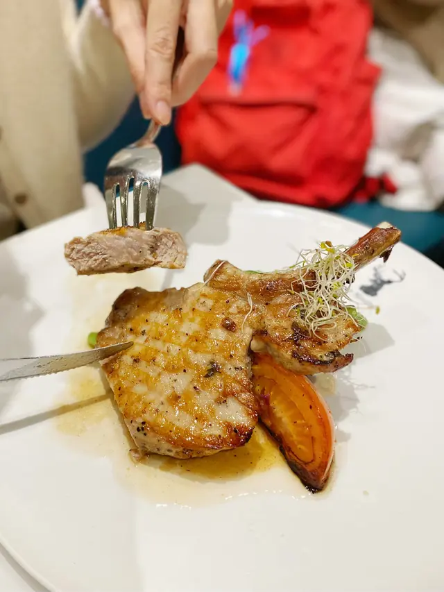 我哋叫咗一個set dinner,前菜有湯同黑松露雲吞,主菜係烤西班牙黑毛豬鞍伴香濃燒汁,上碟見到燒得好靚,食落都有驚喜!豬鞍大塊又夠厚,切落去仲幾juicy,邊邊仲有些少脂肪,完全唔鞋口!豬鞍底下係紫薯蓉,甜甜哋但仲保留到紫薯粒,幾有口感又唔膩!