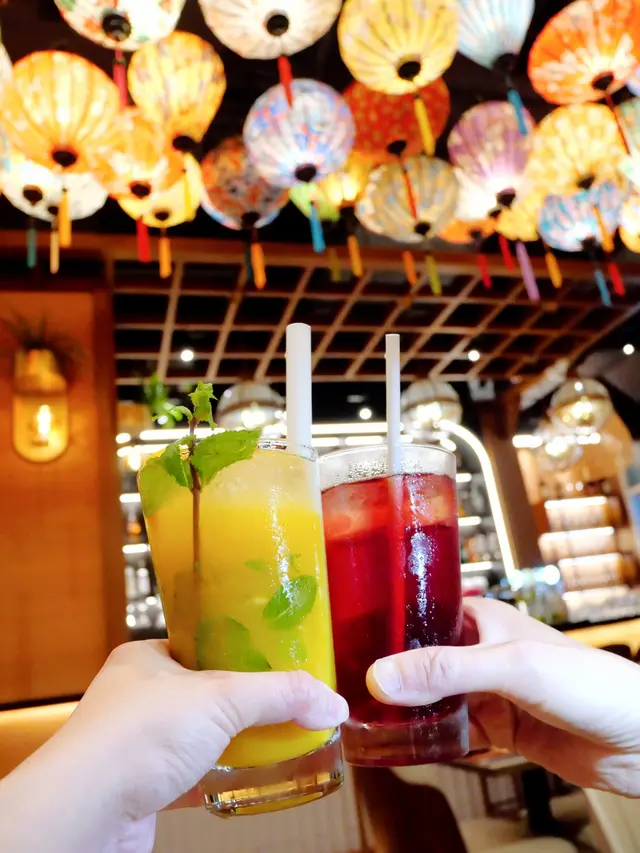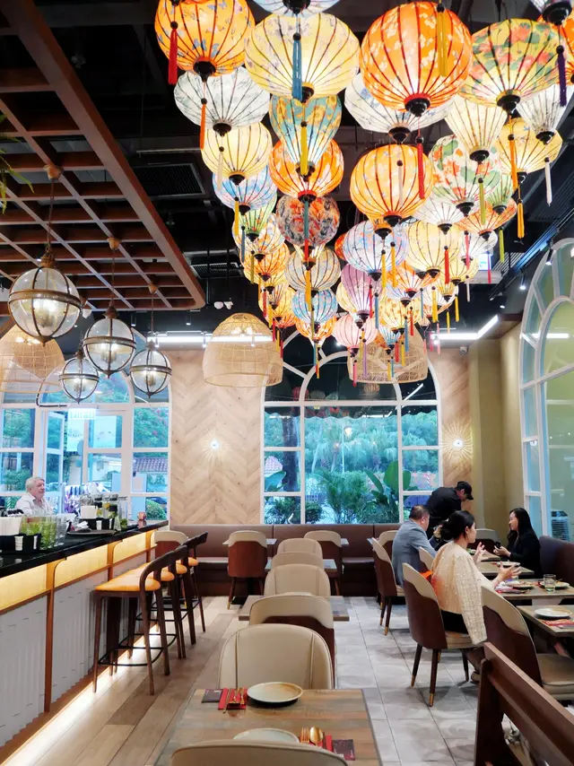 餐廳外部是一幢鵝黃色的歐陸風格建築,裡面樓底特高,天花掛滿色彩繽紛的手工燈籠,營造一派越南會安古鎮風情🇻🇳🏮🏮🏮 這一整個星期都陰天甚至下雨,難得到訪當日天晴又涼爽,加上門口幾棵鳳凰木正好開花,坐在室外或室內都令人悅目娛心🌞🌬️🌳🌺