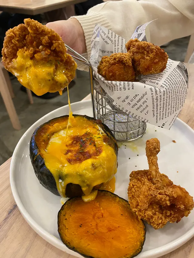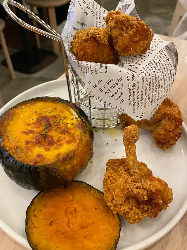 我哋仲跟餐要左個迷你芝士流心蛋燒南瓜伴脆皮單骨雞翼,雖然十級邪惡,但非常好食!雞翼炸到好脆,加埋流心蛋嘅汁非常好食,南瓜肉都非常甜,成個南瓜都比我清哂!