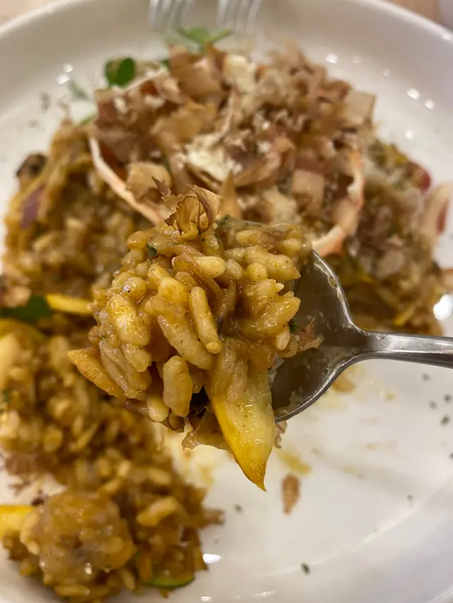 見到晚餐Menu好多都好吸引,揀咗一個焗芝士松葉蟹蓋日式咖喱海鮮燴飯,除咗賣相靚之外,味道都非常之好!咖喱味非常濃郁,蟹膏好多,燴飯配埋洋蔥粒,非常有口感!