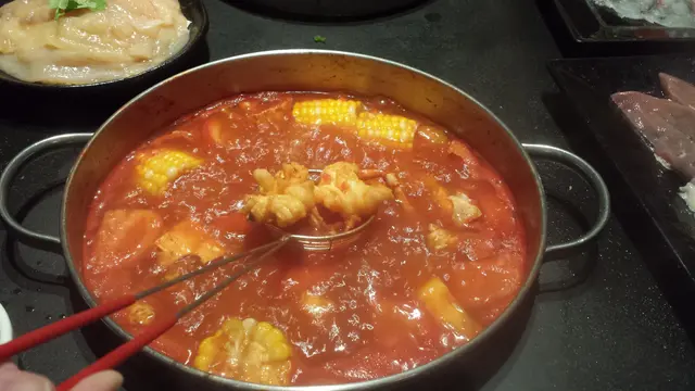 八人圓檯有兩個爐,點了鮮茄粟米龍蝦鍋和招牌鴛鴦鍋。圓檯很大,方便置放火鍋生料,但中間的鍋爐倒有點小,如果個子矮小的,可能要站起身才能把生料滾進鍋內。談到湯底的味道,鮮茄粟米龍蝦鍋的用料十足,橙紅色的也煞是吸引,也有多塊龍蝦肉可供品嚐,無論粟米、新鮮蕃茄、龍蝦也多,只是茄膏下得太多,搶去了其他食材的鮮味。