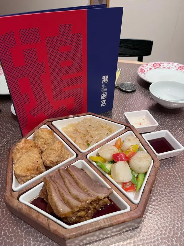 潮州四拼盤 (鵝片、蔥油海蜇、蝦棗、油泡帶子):呢個併盤岩曬好似我咁想樣樣試少少嘅願望,沿用陳年香醇滷水膽,採用頂級獅頭鵝炮製,滷水鵝片嫩滑厚肉、海蜇爽口彈牙、蝦棗香脆鮮味、帶子鮮甜爽口