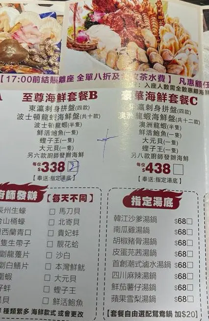 我與友人今晚選了至尊海鮮套餐B ($338每位),及( 另加HK$20) 點選了雙拼火鍋湯底:蕃茄薯仔併南瓜雞湯
