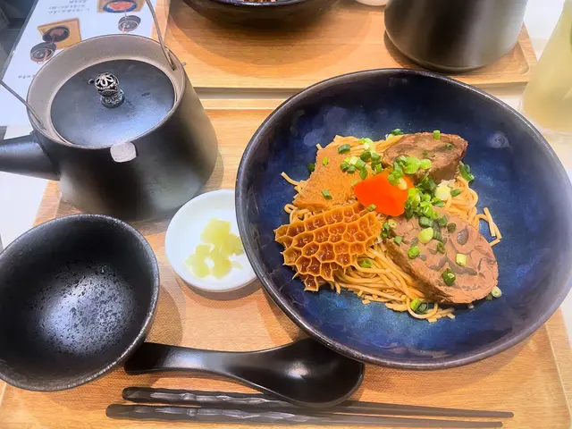 牛腱煮得好入味,完全冇平時嘅牛腥味,而且腍得嚟又保留到口感。未加湯之前已跟撈好蔥油,味道似台灣嘅蔥油撈麵嘅即食麵味,好食但普通。有茶壺好好玩。湯底有啲太鹹,唔好直接倒落碗麵度。最好食嘅方法係當佢沾麵咁食。會飲到清甜嘅紅蘿蔔味同淡淡嘅藥材同牛肉味,再加多少少辣味。