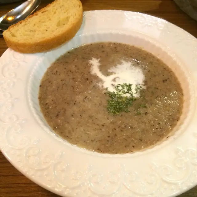 先來餐湯,我們選了蘑菇湯, 西式湯很足料,都是蘑菇蓉,很香滑。 唯一失色的是配上此麵包,由於麵包沒有烘過,沾湯後的口感不太好。
