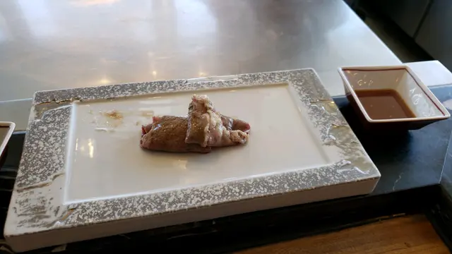 牛肉薄燒 - 我今日至喜歡的菜式,牛肉在鐵板輕輕煎封不超過十秒,立即卷以牛膀等夾料上桌,牛肉大約七成熟,肉汁非常豐富,夾料脆口,而廚師建議除了燒汁更可以加些少日式芥末,一試之下這配搭果然將口感提升至另一層次。