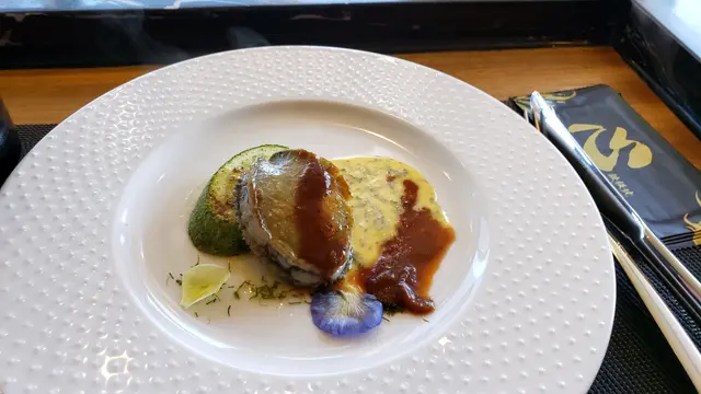 南非活鮑魚 - 鮑魚是在魚缸新鮮拿上來,保證鮮活。鐵板燒鮑魚很講求功力,燒太短時間不容易熟,燒太久又會太老肉質變硬,這裡的燒鮑魚火候剛好,肉質仍保持軟腍而有鮮味,配合其獨特的柚子燒汁,味道更加突出。