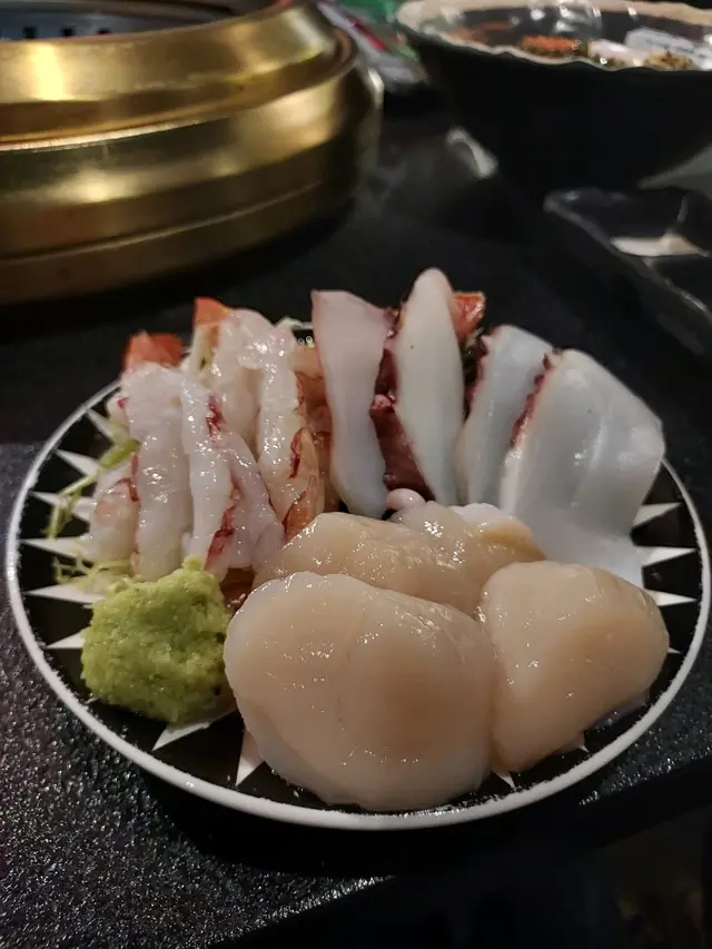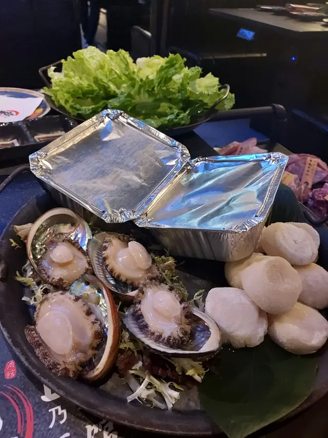 時令海鮮, 包括帶子, 蠔, 和鮑魚, 還有追加的伊比利亞黑毛豬頸肉和柚子蜜五花腩和野菜籃.