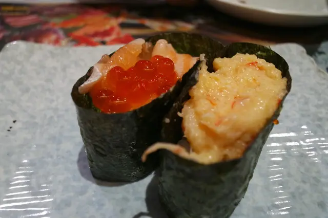 若然還未夠飽肚,可選擇這些火炙壽司,咖喱三文魚(左),原條海鰻(中),和牛壽司(右),這些壽司表面再另加火槍燒過,味道有多些少煙燻的香,壽司的味道更為特出。