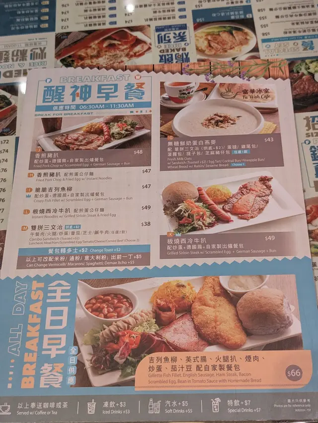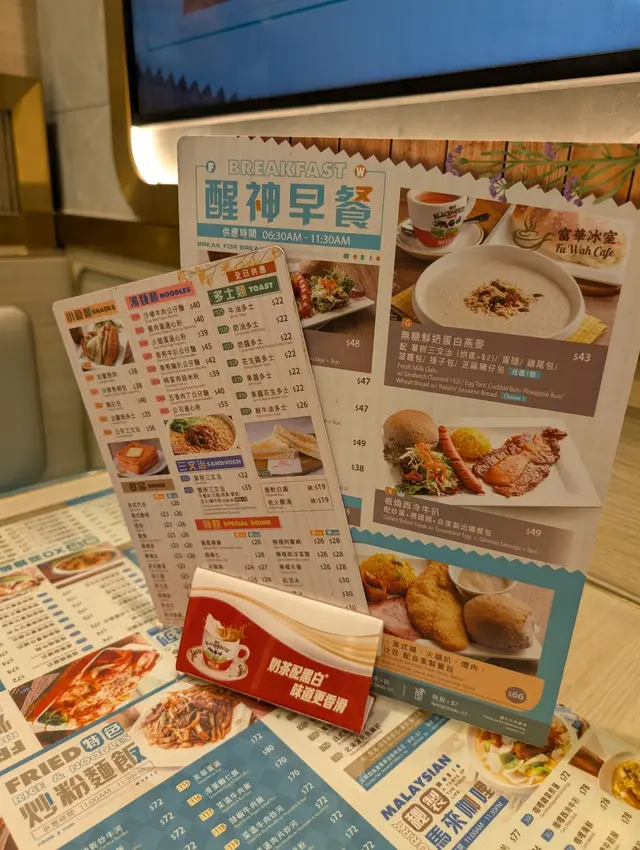 早晨走進富華冰室,店內裝潢寬趟明亮簡約,冷氣充足 ,環境整潔舒適,每張枱面都有黑色小夾板,落單時掃夾著印好QR Code的紙,上菜也蠻快。早餐款式涵蓋經典港式茶餐廳組合,公仔麵餐、扒餐、All-day全日早餐,比較有特色是麵包餐,首推脆皮菠蘿包。