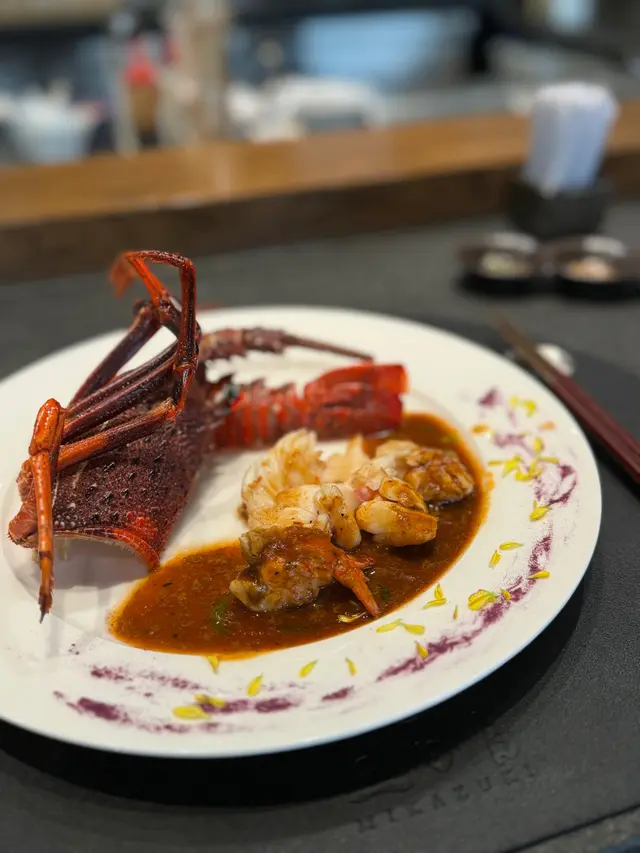 師傅將龍蝦煮至七、八成熟,而不是全熟。肉質啖啖鮮味,入口爽口彈滑。再加上由龍蝦蝦膏煮成嘅濃郁蝦膏醬汁,加上食用花、紫薯粉同羅勒汁,為蝦膏醬汁添加多一份新鮮嘅層次感。
