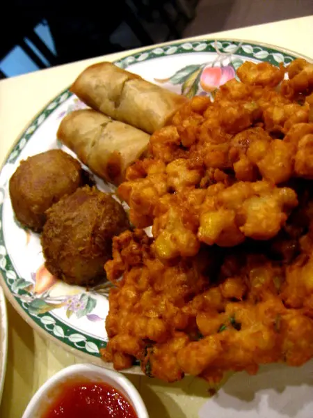 小食拼盤[$34] : 這裡的薯仔牛肉餅跟黃薑飯的重複了~失策失策~但夠粉的薯仔混入牛肉後炸起而成~~當然不能跟男爵薯餅比較~但這個薯味也是重而濃的~而粟米餅丁點不油膩~沾起粉漿炸起來粒粒外脆內爆汁~~而春卷此刻已成為了大配角~~不差但不突出~~也吃得過