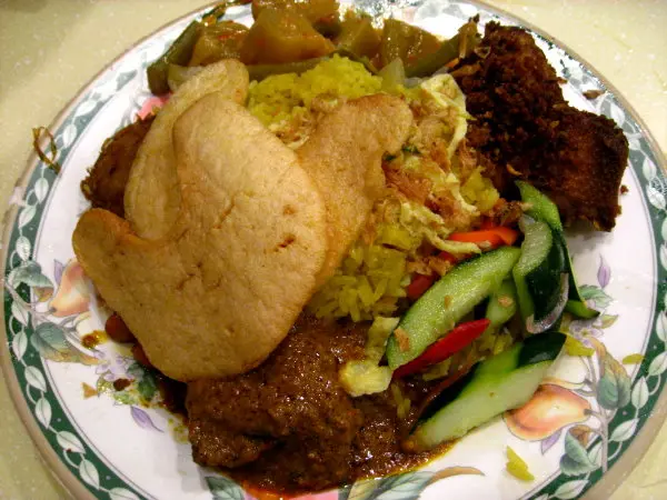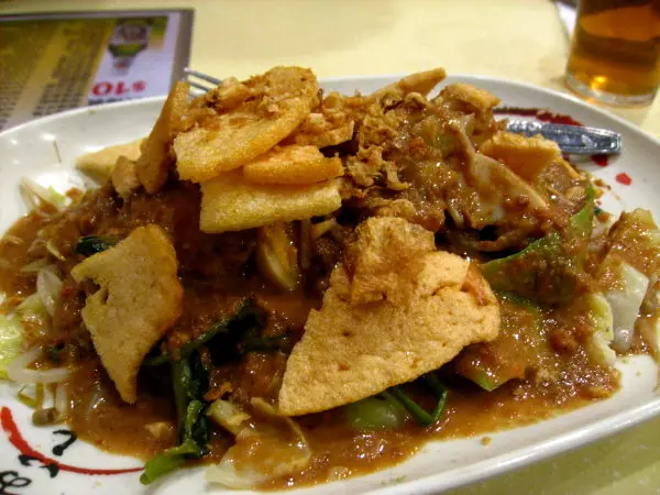 加多加多[$34] : 印尼其一最著名的沙律~~除了椰菜薯仔芽菜之外~也有通菜烚蛋節瓜豆腐豆角~面面灑落弄碎的自家蝦片和炸蒜~~~當然~~這道沙律的靈魂在於其自家製的沙嗲醬~~在當地每家每戶都會用自已的秘方去調配~這裡的濃稠惹味~~當中摻有粗粒的花生碎~~較娘惹吃到的更為豐富~