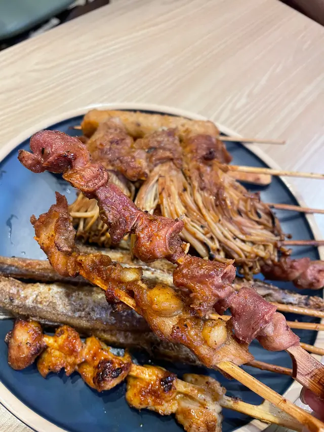 入到去環境比起平時嘅串燒店帶點新潮,我哋一坐低就 睇menu ,我哋叫咗一大碟串燒 ,包括 :大墨魚咀 鹽燒多春魚 牛肉串 肥牛 金菇串 阿拉伯羊肉串 雞軟骨兩串 雞腎兩串 仲有免治雞肉棒 再叫咗個川北炒粉絲!