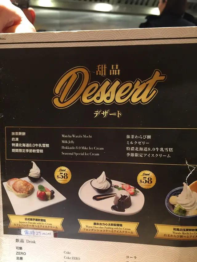 從價錢看$99就有一個甜品拼盤,確是化算,加上賣相精緻,款式又多,可以獨享亦可跟朋友分享。甜品包括:紅豆抹茶厥餅、水信玄餅、咖啡奶涷、65%黑朱古力心太軟和軟雪糕。
