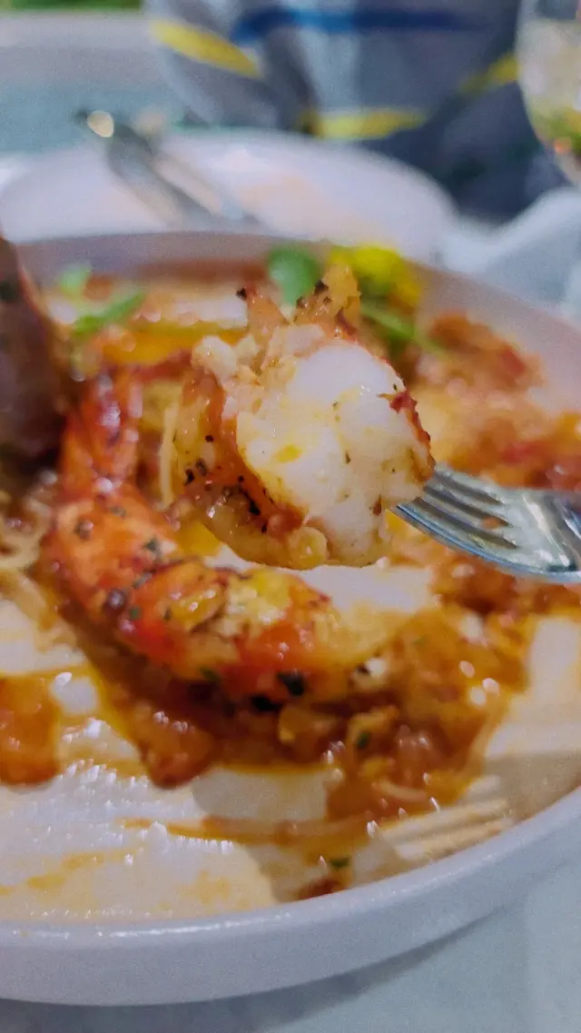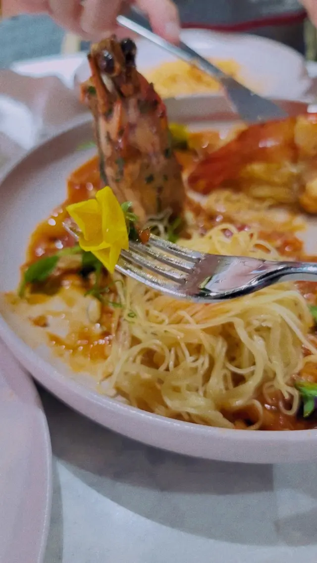 上桌是大大盤的天使麵🍜,醬汁滿滿,就像虎蝦在暢泳中🏊🏻。