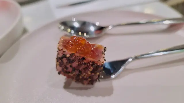 最特別是輕煎三文魚🐟,外層的胡椒輕輕刺激著味蕾,脆脆的口感與內層柔軟的刺身吞拿魚相映成趣,比普通吞拿魚刺身好吃! 而吞拿魚🐟上滿滿的魚子🟠,在口中爆發著海鮮的味道,一件小小的吞拿魚就己經充滿層次,十分有功架!