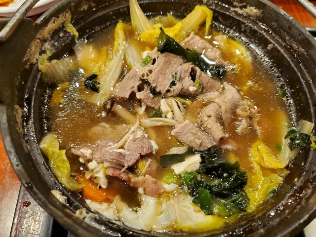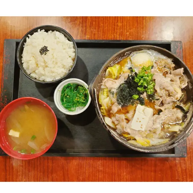 牛肉壽喜燒鍋:份量充足,鍋中有豆腐、蘿蔔片、海帶、熟牛肉片、金菇、粉絲、菜,很豐富!配菜還有綠色的中華海草,很爽甜!日本珍珠米,飯質跟平時的飯完全不同,珍珠米質地更黏稠。