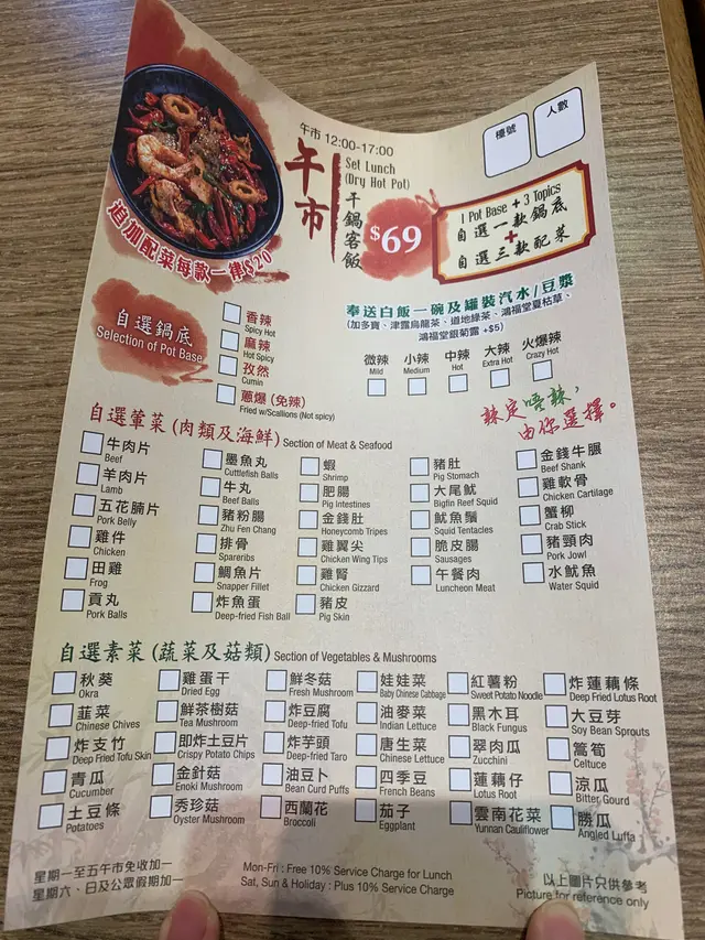 福榮街 重口味干鍋午餐 conlukLevel 42021-09-17296 views Follow 重口味干鍋客飯!之前經過深水埗都想試吓呢間餐廳,感覺有好多款式食材選擇。午市干鍋客飯$69- 可以揀香辣、麻辣、孜然、蔥爆,其中一個鍋底,然後自選三個配菜,送飯同飲品。我選擇蔥爆鍋底加金錢牛𦟌、紅薯粉、炸芋頭。其中一個朋友食得辣,成個鍋鋪滿辣椒,睇落好得人驚,不過佢話唔係好辣。整體干鍋客飯油膩感較重同偏鹹,食完午餐即刻覺得口渴。肉類被鬆肉粉醃到冇乜口感同味道,芋頭條炸得比較乾,薯粉口感唔錯,不過同白飯一齊食唔太夾,太多碳水化合物。炸豆腐唔錯,入面口感軟身,外層吸滿醬汁,不過都係偏鹹。應該唔會再食干鍋客飯。干鍋客飯$69干鍋客飯$69干鍋客飯$69The above review is the personal opinion of a user which does not represent OpenRice's point of view.LikeShare福榮街 重口味干鍋午餐 嫲嫲辣辣 (福榮街) https://s.openrice.com/QrKT0O8azW0Report Post Ratings3Taste3Decor3Service3Hygiene3ValueDate of Visit2021-05-28Dining MethodDine InSpending Per Head$69 (Lunch)