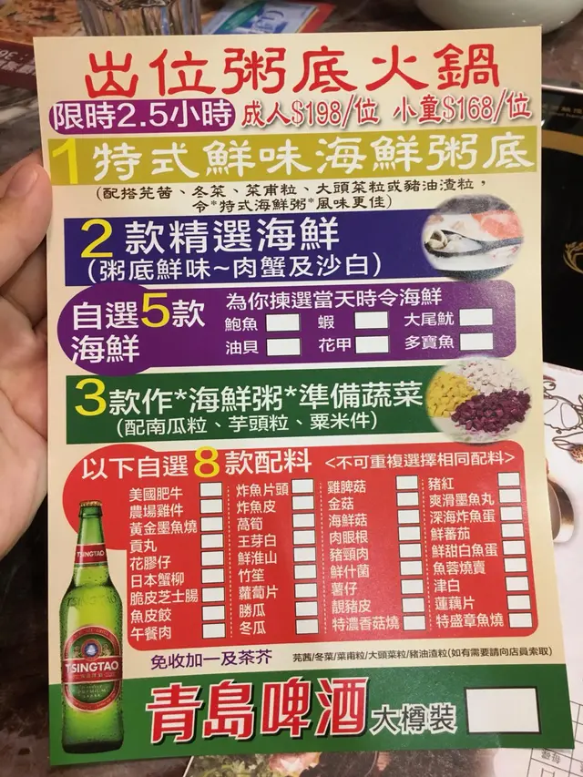 我地嗌咗肥牛、豬紅、海鮮菇,後面兩樣都唔係平時成日食到嘅配料,海鮮菇特別好食同入味。再嗌咗個蘿蔔同蒿荀,溶入粥好甜。墨魚丸彈牙,娃娃菜同粟米都夠甜,加落南瓜同芋頭,冬菜、豬油渣粒等配菜,粥嘅口感更多層次。我中意佢會加嘅脆片,多咗種口感。