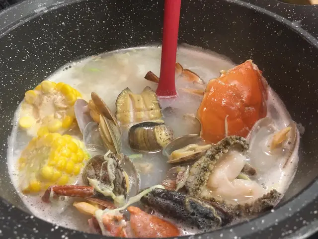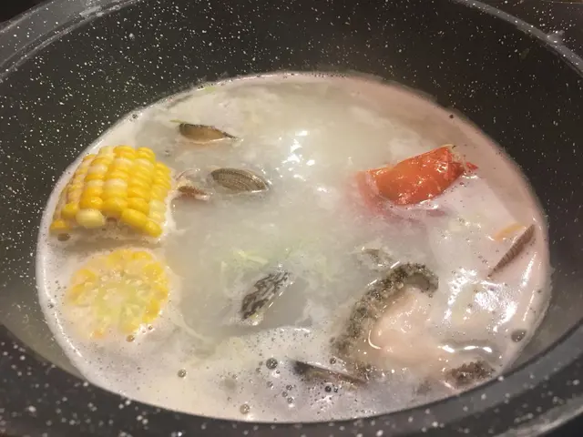 有蟹有沙白,再揀多五樣海鮮,朋友唔食魚,所以就揀咗淨低個五樣,成盤海鮮咁上,睇落好豐富。蝦同鮑魚最為突出,鮑魚處理好咗非常容易擺入口。沙白同花甲嘅份量都唔少,心急肚餓嘅我地就分咗兩三次就放哂佢地入去煲入面,睇落去超級澎湃。
