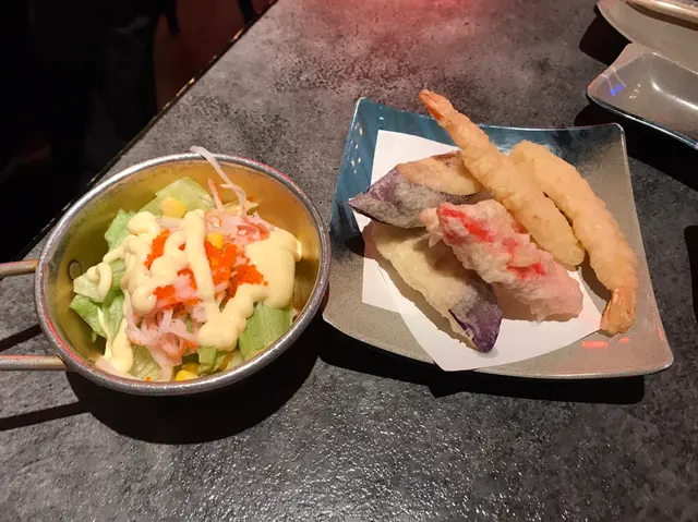 蟹子沙律;大蝦、茄子、松葉蟹棒天婦羅,天婦羅幾鬆化。