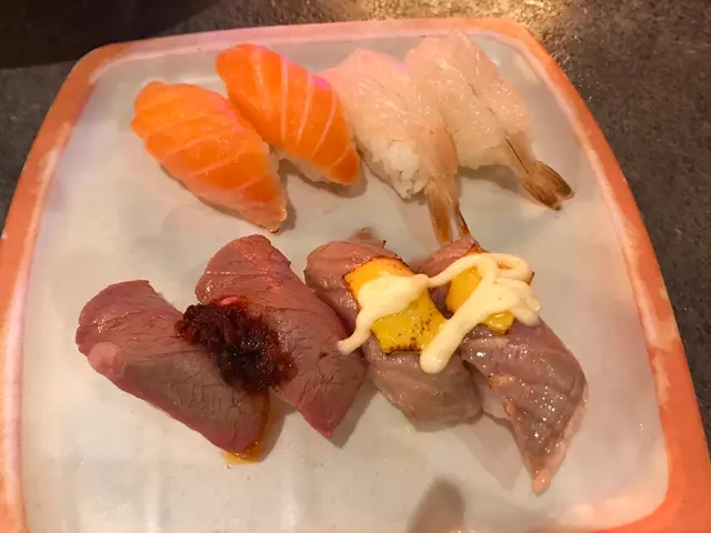 三文魚壽司、虎蝦壽司、火焰和牛壽司、火焰芝士三文魚壽司。