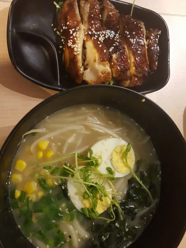 到烏冬來到後, 先試試他們的自家豚骨湯底, 嗯..有點鹹... 配料有些粟米,昆布, 蔥, 菜苗, 芝麻, 芽菜, 半隻蛋 (相片多了半隻蛋是朋友給我的), 印象中和隔離間的火山石好似.....但味道差很遠.. 這個烏冬真係好普通...份量都幾少...鰻魚汁照燒雞扒都冇乜特別, 唔係好食到鰻魚汁味..