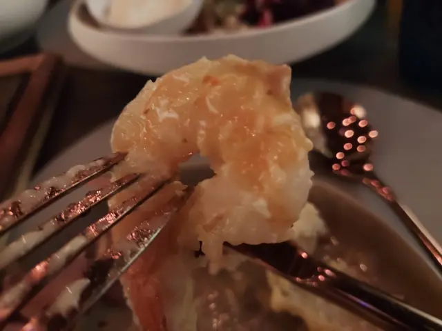 大蝦有4隻,配上香濃牛油蒜醬汁。大蝦是有殼的。需要自己剝殼。