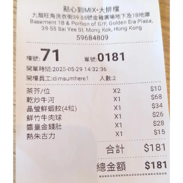 2人總共價錢$181,茶位每位$5,免加一!
