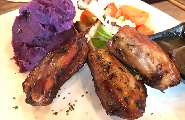 佢lunch有好多選擇,有飯,意粉,烏冬,紫薯。點了個”意式香草烤焗豬仔脾,配紫薯”,另外加配餐飲則點了杯熱咖啡(+$4)。