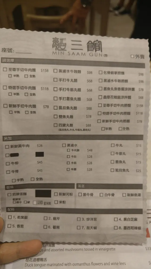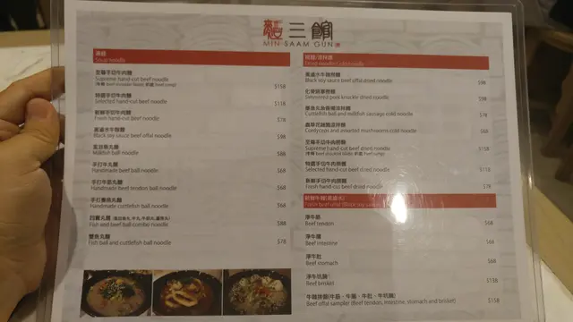 餐牌理所當然地以牛為主, 但像現代拉麵店有多個選項. 由半/全熟, 配料, 麵底等均可選擇.