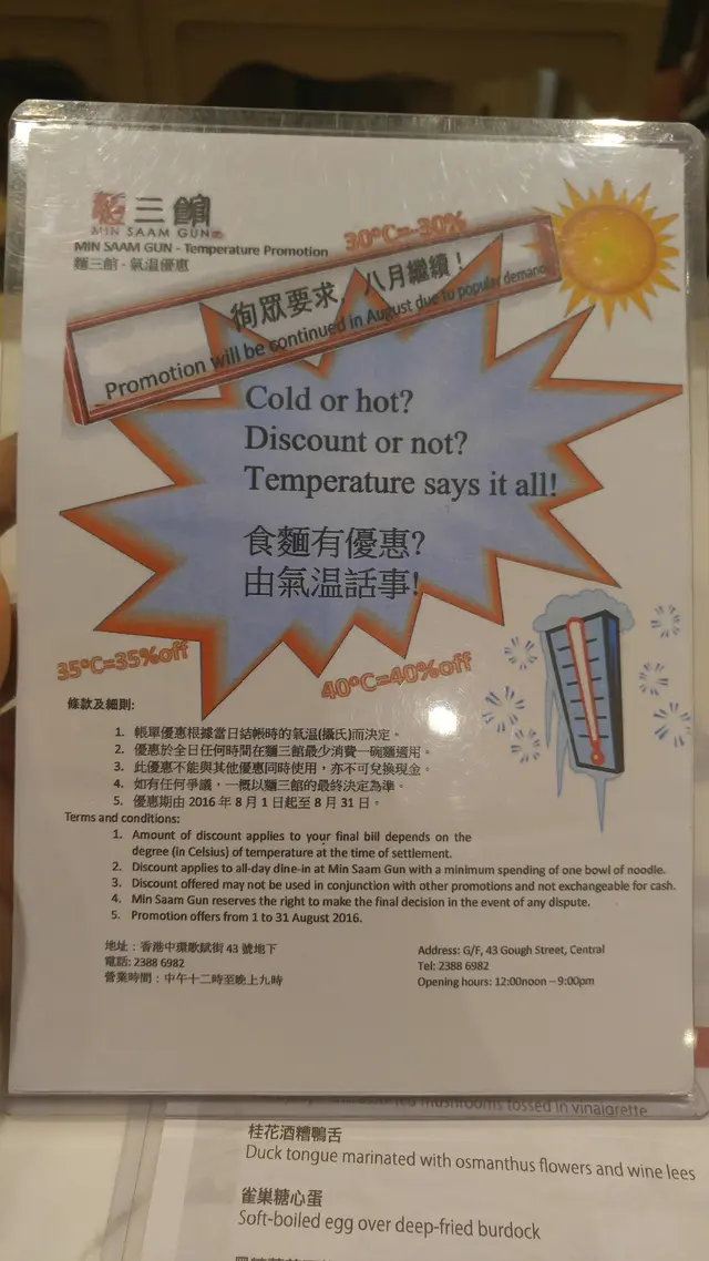 聽說開店時有半價優惠, 現在應該是過了, 但推出另一個隨溫度而增減的折扣. 當天的溫度達33度, 本來在門外是有欲步的意思, 看到最少7折的優惠令我馬上推開大門進來.