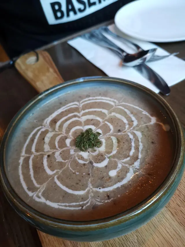 黑松露磨菇湯,香濃嘅黑松露加打碎嘅蘑菇配上忌廉,飲落非常綿滑,配上一塊鬆脆嘅餅乾,攞嚟點湯食簡直一流。