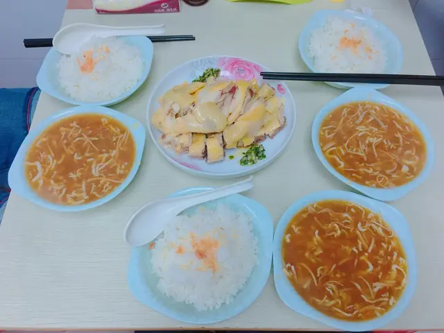 雞絲魚翅撈飯。有雞絲、魚翅、冬菇、南瓜於內,材料滿滿的,很好吃,它最有趣的地方是翅中加入少許南瓜一起煲,使鹹鮮中帶點甜,恰到好處。