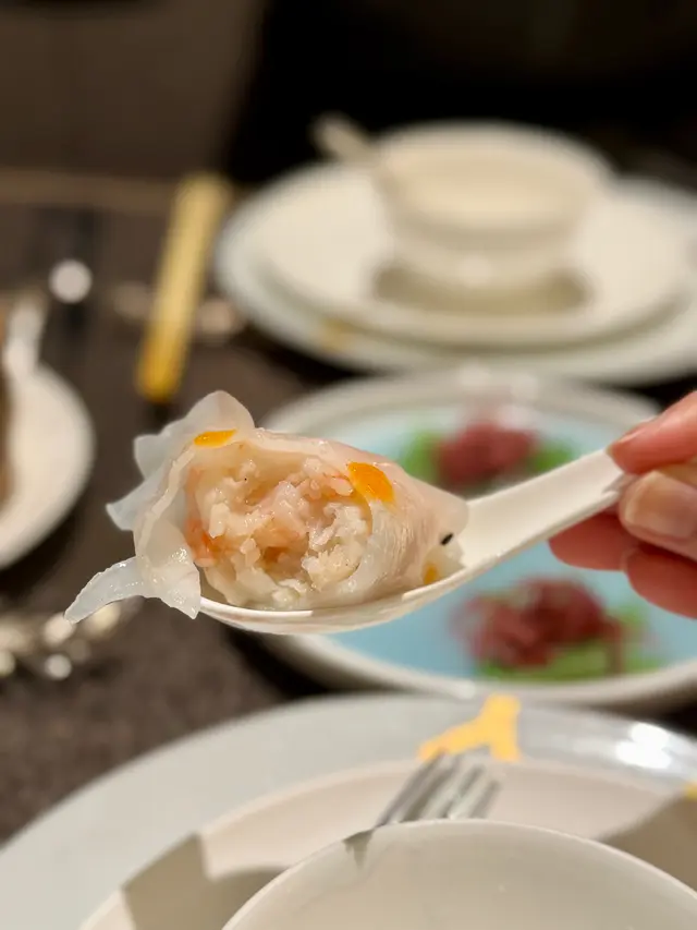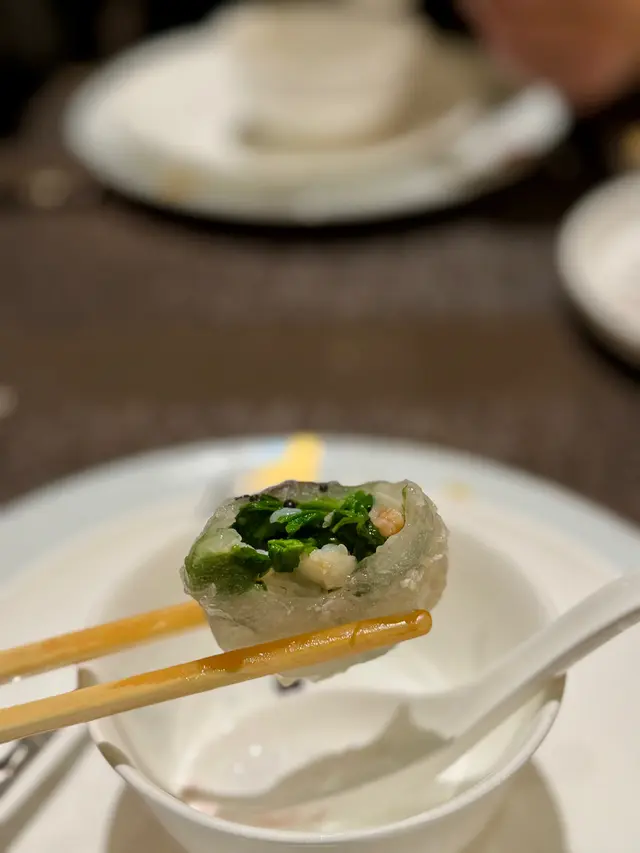 透薄的水晶皮包著絲絲嫩滑豆苗,再配上鮮味的帶子及鮮蝦肉,滿足。