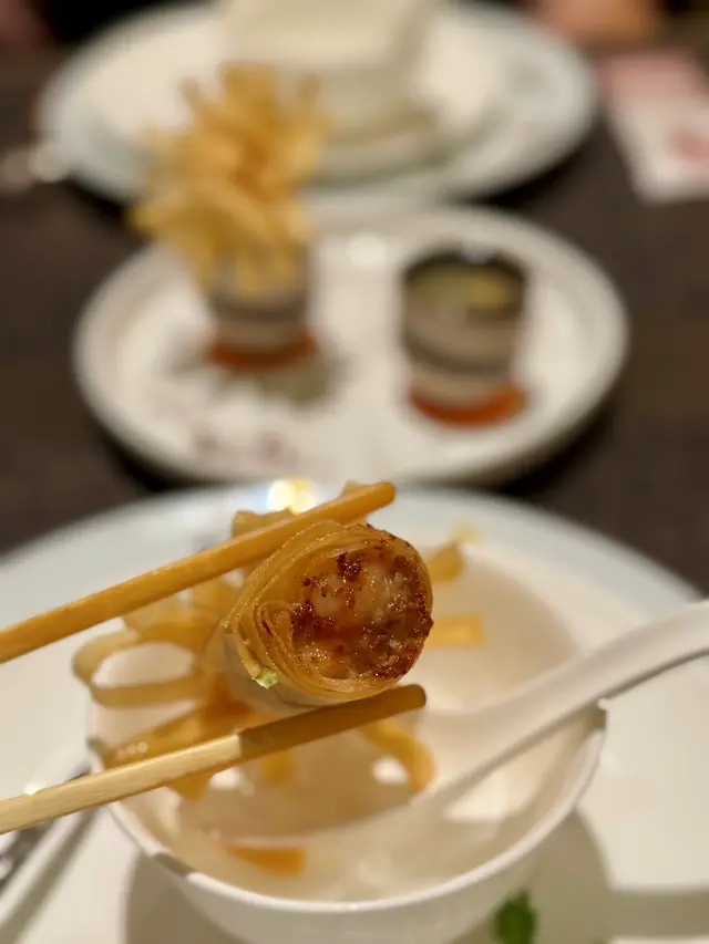 意想不到春卷化成精緻的菊花,即炸上檯熱騰騰,菊花卷香脆不油膩,內裡是惹味的鮮蝦餡,同時有松露香味散發出來。