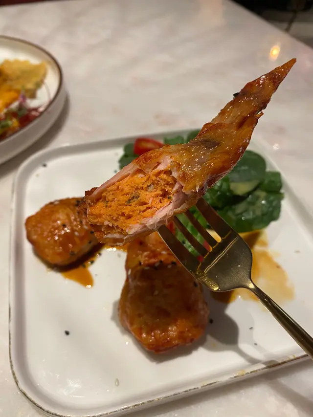看到菜名的时候,我就觉得这个应该很有特色。事实上也确实不错,鸡翅外面是蜜糖的,但里面是满满明太子,有一点点微辣。甜辣的碰撞,我觉得都算是有特色。但让我最开心的,就是它整个翅根部分都是无骨的哦