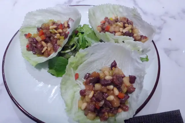 生菜盞可選豬/牛/海鮮/素菜,我們選了安格斯牛。生菜盞青芥末味雖然不強,但入面卻放滿安格斯牛、松子、菜脯等不同食材,口感豐富之餘,調味亦濃淡得宜,用來餸飯一流。