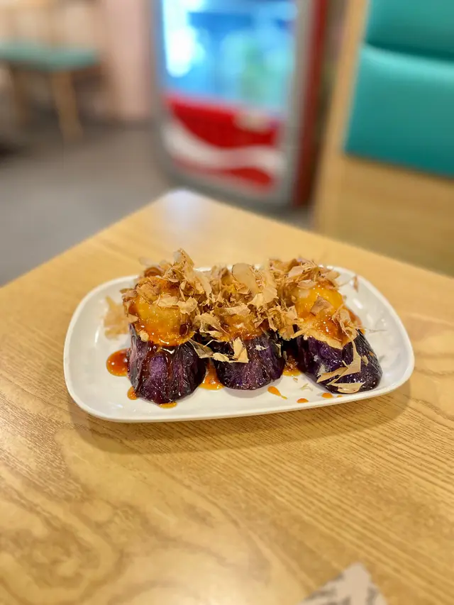 日式Fusion中茶茄子,上層佈滿木魚碎,茄子以墨魚滑釀製,口感軟綿綿嘅茄子,配以秘製燒汁烹調非常惹味。