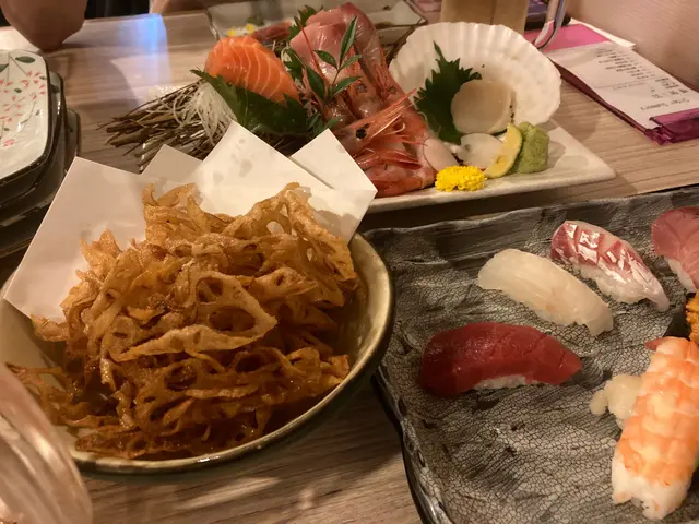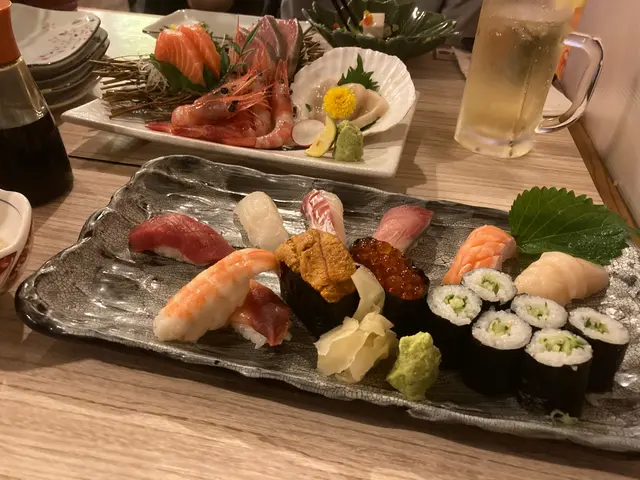 壽司盛合,有油甘魚、北寄貝、鯛魚、海膽、吞拿魚等等,非常豐富,我比較喜歡海膽同吞拿魚,海膽入口甘香, 吞拿魚味道鮮甜。