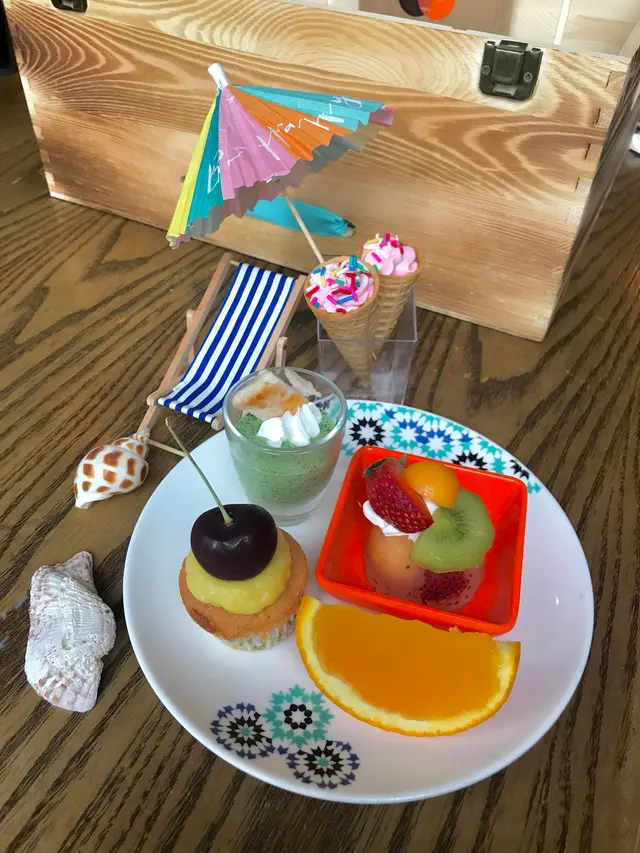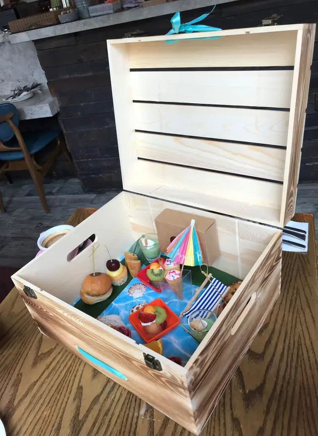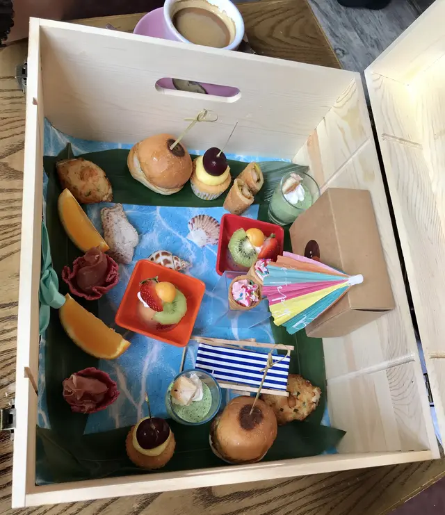 之後侍應搬左一個木箱過黎,個木箱都幾大個,侍應一打開,原來啲食物就係放晒係木箱裡面,比起平時食開既三層英式甜品架,今次餐廳用木箱裝住啲食物會特別好多,用黎打卡一流。個木箱入面仲會播放海浪聲,店員話如果我地唔鍾意海浪聲可以熄左佢。