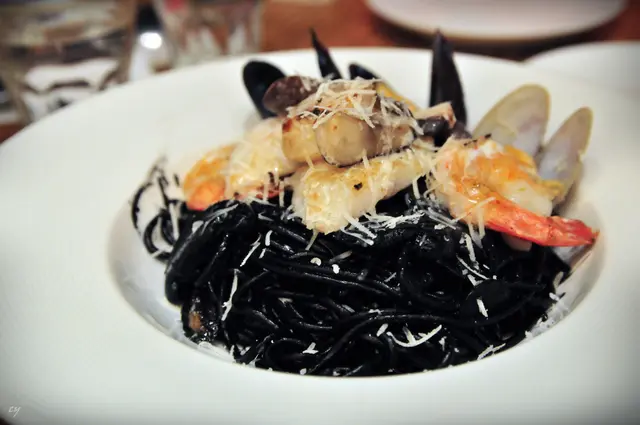 海鮮份量十足: 結實大蝦(2只)、美味青口(2只)、鮮甜帶子(2只)、還有酒香的蜆、魚柳及魷魚。不得不讚, 其精髓在於墨魚汁麵上。麵條是被墨魚汁是"包住"而且富彈性, 而不是泡著或掛著。吃畢後, 只見碟底墨魚汁"跡", 而不是"水"或"汁"。很滿足, 雖然變成"烏咀狗"。順帶一提, 墨魚是高膽固醇之食物, 但其墨魚汁卻可減少膽固醇喔~