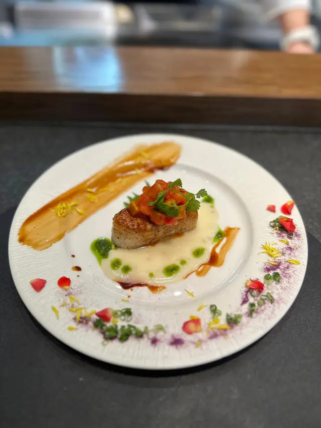 深海野生白鱈魚以食用花瓣點綴,擺盤精緻。白鱈魚非常嫩滑,很推介這道菜式。
