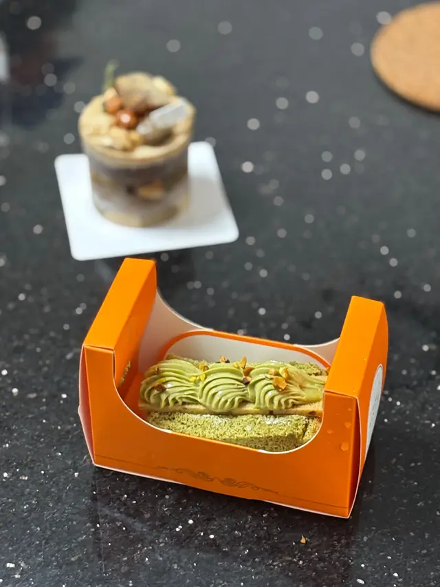 個蛋糕名好吸引,低糖低油配方,焙茶戚風蛋糕,食到有焦糖榛果粒,芝士忌廉,脆餅,一些曲奇,面上有一塊蕨餅,口感極豐富,甜度比開心果那件蛋糕高兩度。😋