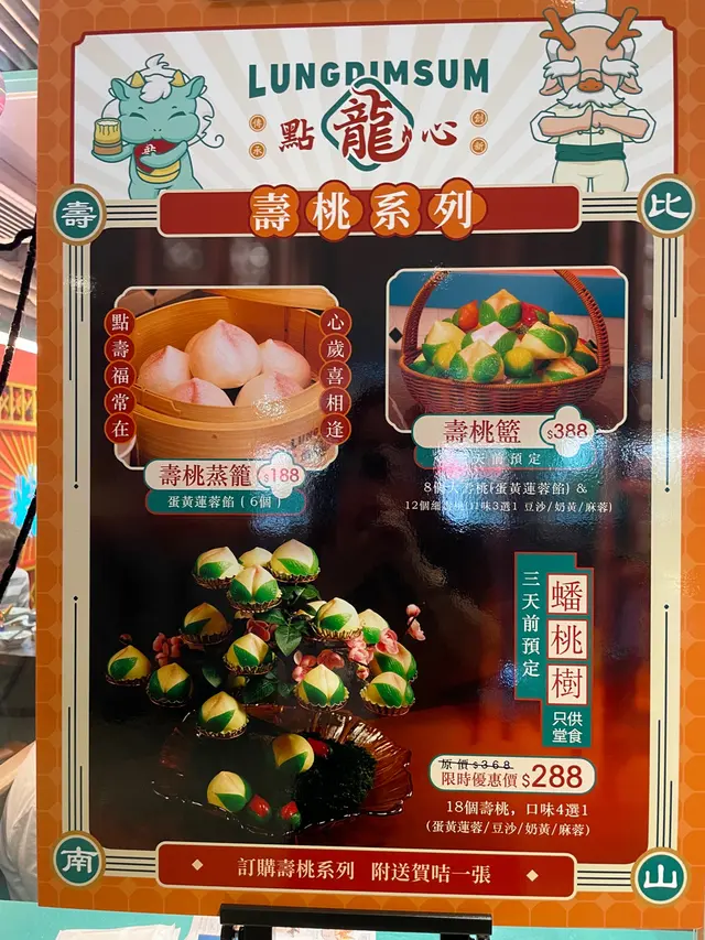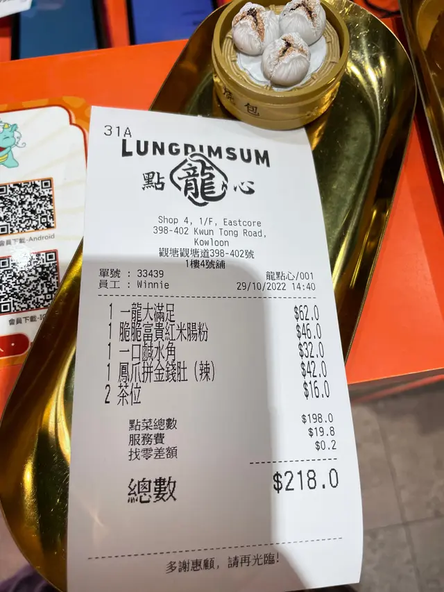 除了觀塘,在灣仔也開了分店,所以為了慶祝分店開張,每枱客人都送贈一客甜品,我們叫了幾款點心,可以看以下照片,點心賣相精緻,味道也可以,其中一款點心叫一龍大滿足,就有幾款不同的蒸餃,有基本的蝦餃和燒賣,也有麻辣餃和斑斕餡的壽桃。地方就不大,像茶餐廳格局,服務員就可以啦!