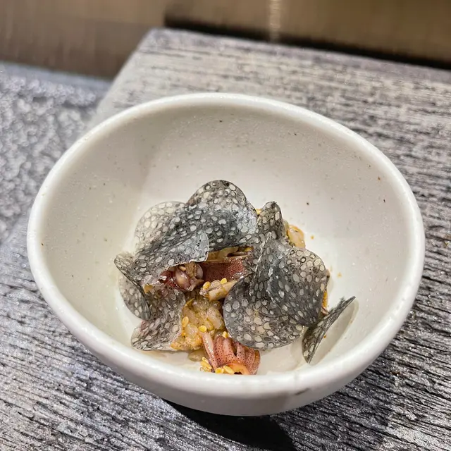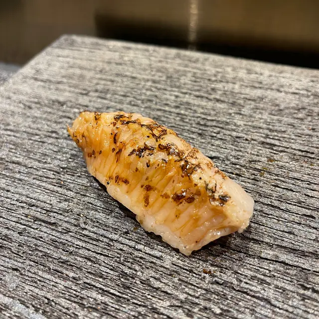 同樣是鰈魚這次用上了裙邊(Engawa)的部分以火炙處理,將甘甜濃郁的魚脂迫出,魚油入即溶,香味於口中逗留良久不散。